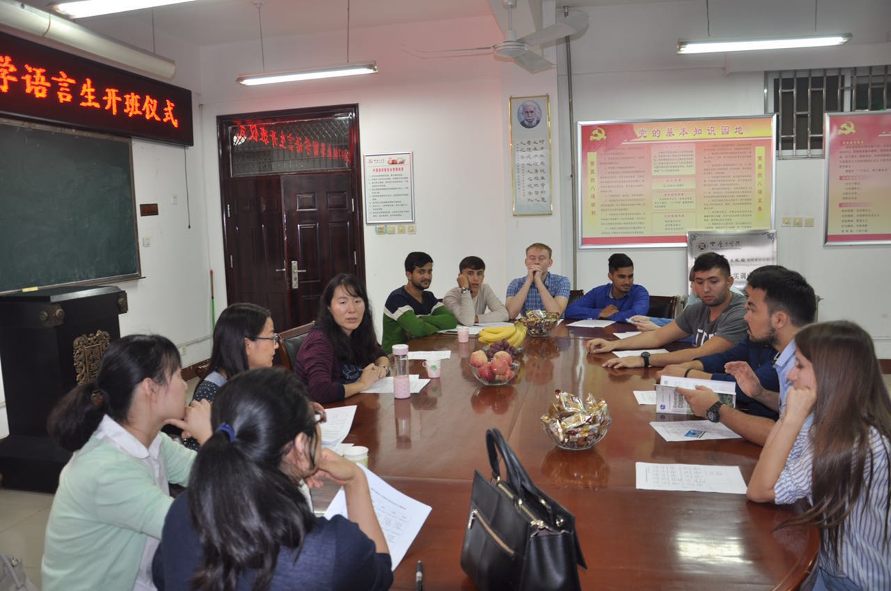 开班仪式的第二个议程,所有任课教师、留学生辅导员、学生助教与留学生一起座谈,座谈期间分发了留学生的学生一卡通,本学期课表,学生情况调查问卷,介绍了本学年所使用的教材,接下来的教学进程,以及通过一年的学习可以使留学生达到的汉语水平。此外,还选举了2017级留学生班的班长,并让留学生与今年会学生助教进行了对接。通过座谈,详细了解了留学生的国别、年龄、宗教信仰、兴趣爱好以及目前的汉语程度,为接下来的教学和语言实践打下了基础。