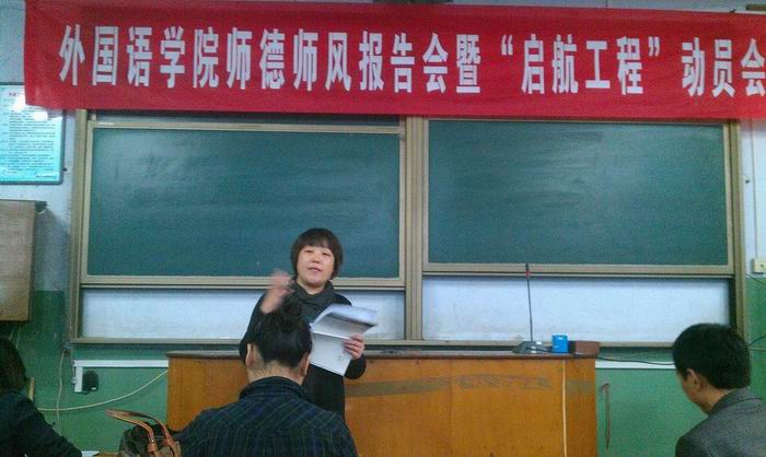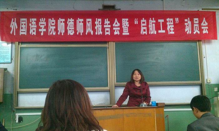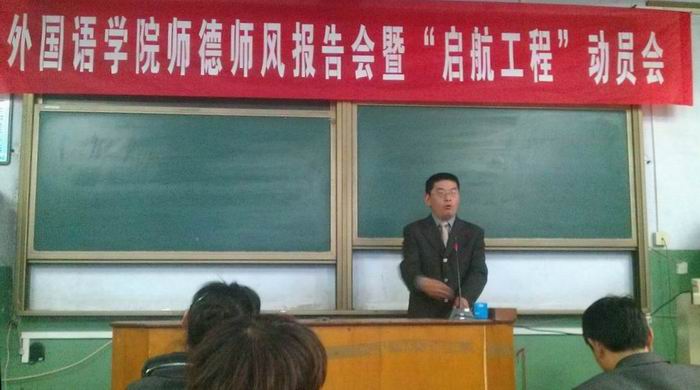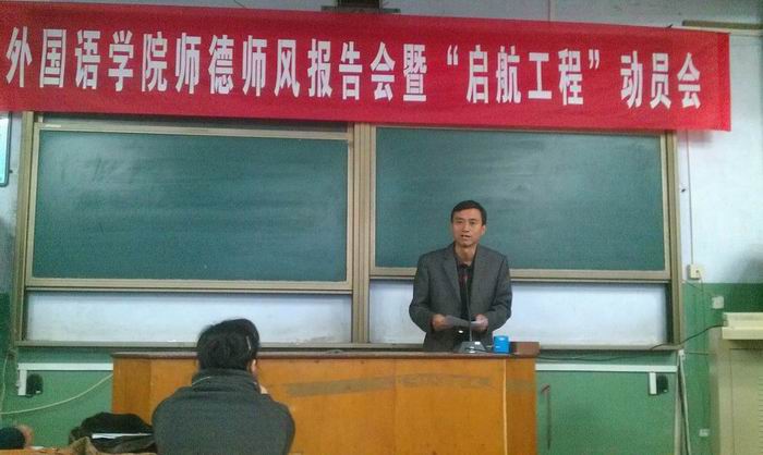 2012年10月26日下午,今年会官方网站召开师德师风报告会暨“启航工程”动员会,今年会官方网站全体教师共同学习了今年会《教师课堂教学行为规范》和《教学事故认定及处理办法》。校师德师风报告团成员董学武教授为全体教师做了《师德的内涵和修养》的专题报告。董教授结合自己的生活和求学经历,论证了师德就是爱教育、爱学生的深刻内涵,师德修养就是师德认知和师德养成两部曲的实践总结。