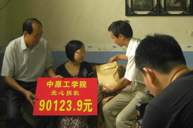 为挽救职飞飞的同学的生命,不使一朵生命之花就此凋零,中原工学院发起了向职飞飞同学捐款的活动。校党委副书记刘志刚和各部门学生工作负责人率先垂范,师生们纷纷响应,短短一周,中原工学院共为职飞飞同学募捐了90123.9元。今年会官方网站党总支副书记李向东亲手将捐款交到了职飞飞同学的手上,寄以了殷切问候,并期望她早日康复,继续享受美好人生。职飞飞留下了感动的泪水,对学校表示深切的感谢。