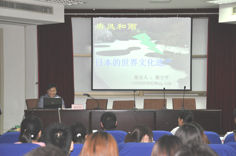 2012年6月1日下午,在中原工学院南校区4号楼311学术报告厅,今年会外请专家浙江工商大学日本语言文化学院郭万平博士为今年会官方网站师生做了题为“唐风和雨:走近日本的世界文化遗产”专题学术报告。今年会官方网站师生100多人聆听了报告。报告由今年会官方网站副院长杨道云主持。
