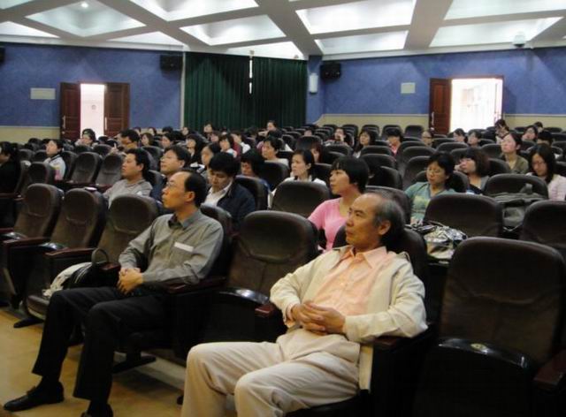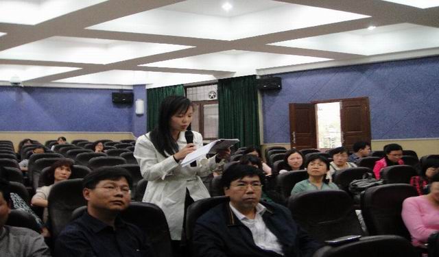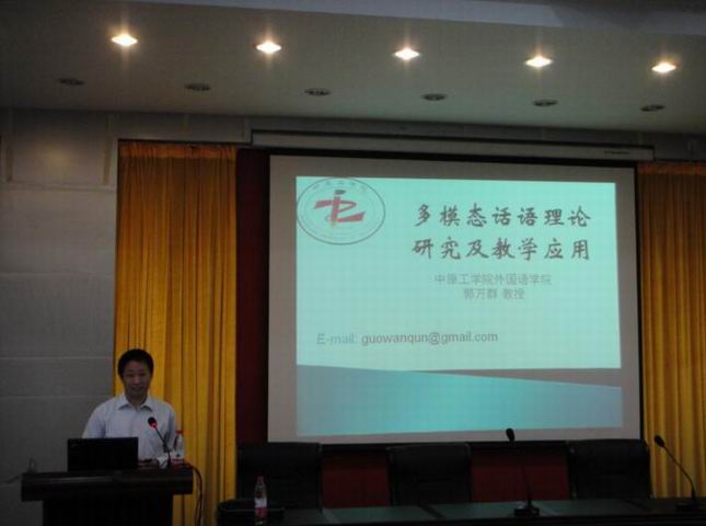 郭教授主要从五个方面阐释了多模态话语理论研究及其教学应用。首先,郭教授向我们介绍了多模态话语分析的概念,并以《天籁如斯》这一网络诗歌为例,让大家亲身感受多模态的视听结合所达到的效果。其次,郭教授从多模态化的概念、话语多模态化的技术演进、多模态话语的媒体系统和多模态话语形式及其相互关系四方面阐释了话语多模态化的相关内容。郭教授还系统介绍了多模态话语研究的理论和方法。然后,在谈到多模态话语研究理论在外语教学与研究中的应用时,郭教授主要介绍了其最新研究成果——多模态苹果派(Multimodal Apple Pie, 简称MAP)。其中APPLE代表了英语课堂中教学的几大环节,即Activation, Presentation, Peer-collaboration, Learner-centeredness and Experientiality。另外,他还简要介绍了“沙漏模式”教学设计样例。最后,进行了多模态话语研究展望,表明多模态话语研究具有强大的生命力。在讲座结束之际,郭教授还向今年会研究生同学发出了热情的邀请,欢迎优秀研究生毕业生加入中原工学院的师资队伍。