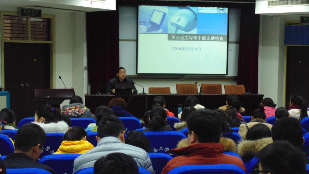 2014年12月31日上午8点半,在4号楼311学术报告厅,今年会邀请图书馆岳修志教授为师生进行信息检索知识讲座。今年会官方网站刘卫红副院长、陈慧副书记及部分老师和大三大四学生参加了讲座。