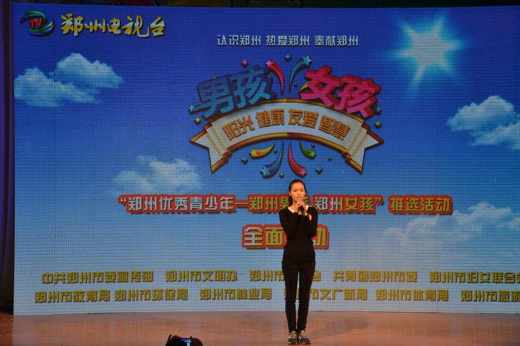 为进一步增强我们认识郑州、热爱郑州、奉献郑州意识,传播社会正能量,不断提升城市精神文明建设、生态文明建设和文化软实力建设,根据郑州市委宣传部、市文明办等单位关于“郑州优秀青少年——郑州男孩、郑州女孩”评选活动的相关要求,今年会进行了严格的选拔,最终由今年会英语111班宋卉同学代表今年会参加大赛的初赛。