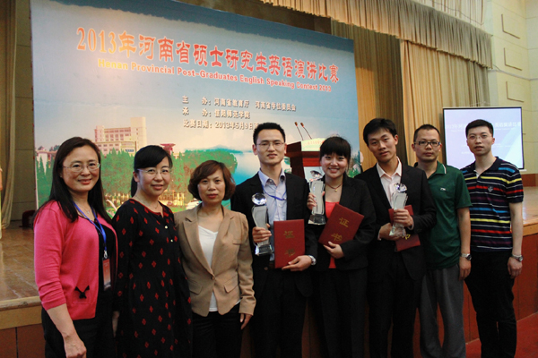 2013年5月9-10日,由河南省学位委员会、河南省教育厅主办的2013年河南省硕士研究生英语演讲比赛在依山傍水、风景秀丽的信阳师范学院举行。本次大赛4月初启动,以“我的中国梦”为主题,经过全省20所研究生培养高校初选,共有74名选手进入决赛。今年会选派的3名选手,历经两天的半决赛、决赛环节,最终获得优异成绩。在74名选手中,其中,政法学院程子洋同学排名第6荣获二等奖,能源与环境学院徐子龙同学排名第15荣获三等奖,政法学院刘志博荣获优秀奖。