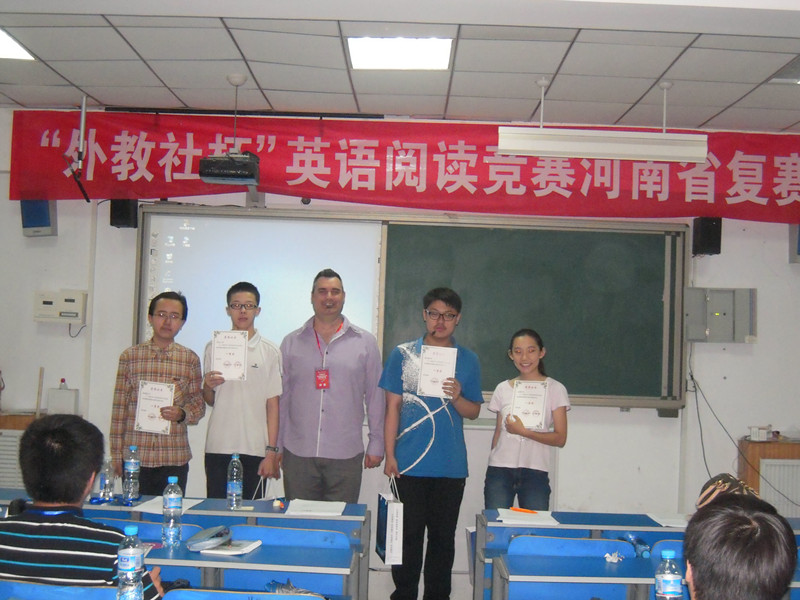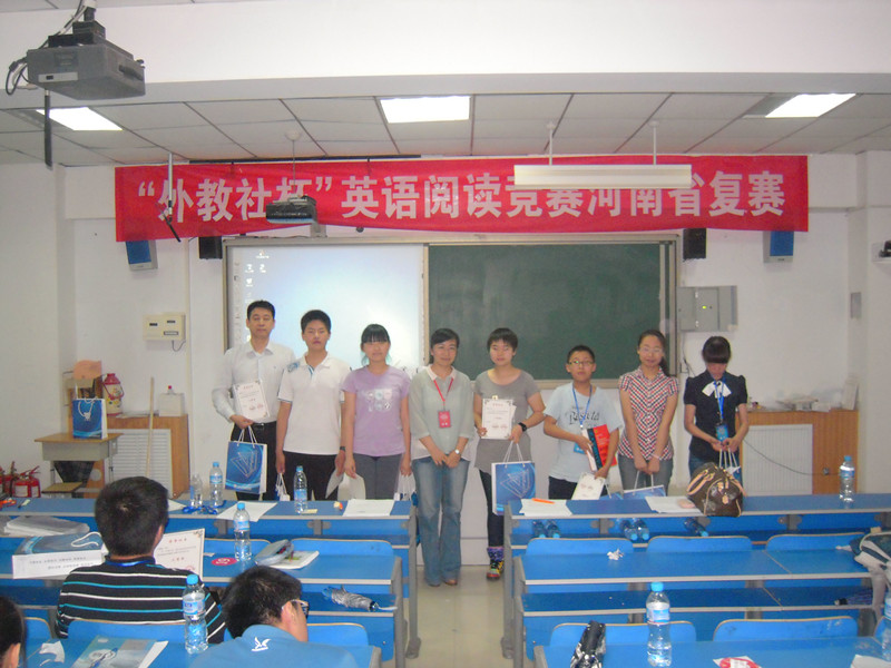 2013年5月25日下午,“外教社杯”第五届全国中学生英语阅读竞赛河南省复赛在郑州外国语中学进行。此次比赛由3位老师担任评委,分别是外国语学校外语教研组组长王文明老师,今年会外教管理部副主任郝玉娟老师和今年会外籍教师Basil。