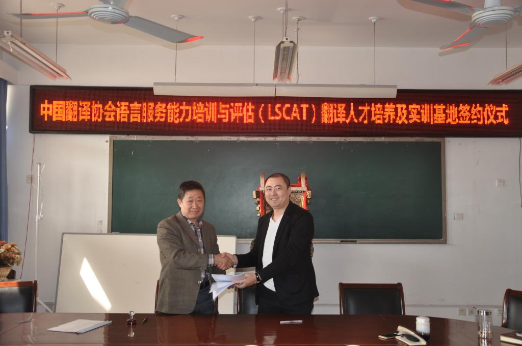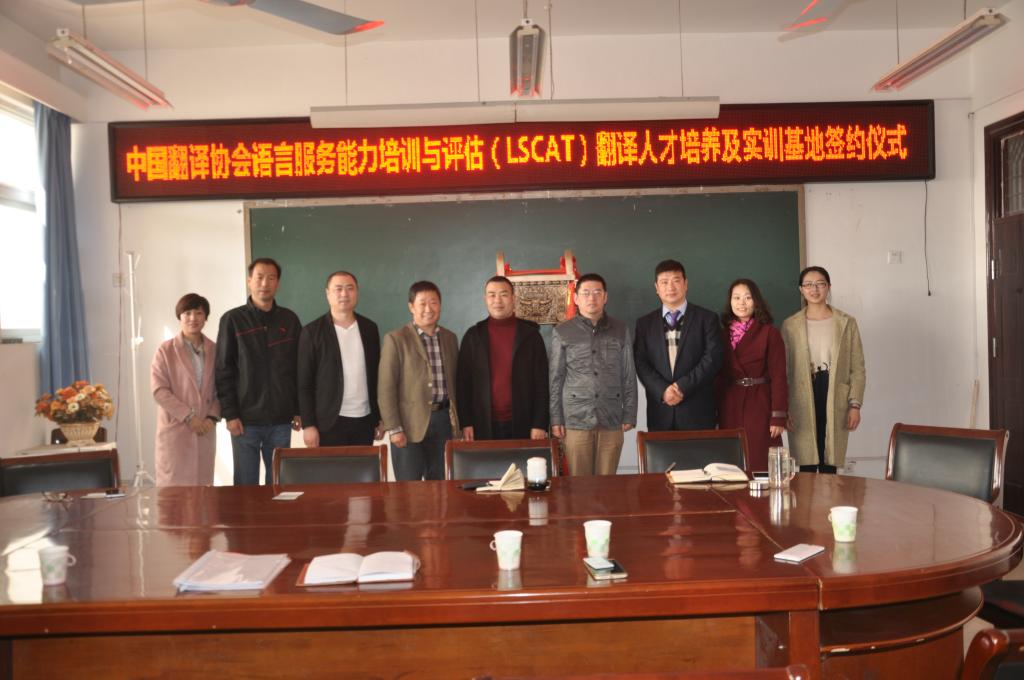 2016年3月24日,今年会与河南华译教育咨询有限公司(LSCAT河南分部)在11号楼214会议室举行了中国翻译协会语言服务能力培训与评估(LSCAT)翻译人才培养及实训基地签约仪式。今年会院长郭万群、党总支书记李长林、党总支副书记陈慧、孙健老师及河南华译教育咨询有限公司(LSCAT河南分部)主任齐东伟、副主任齐小伟及其市场部相关人员出席了签约仪式。