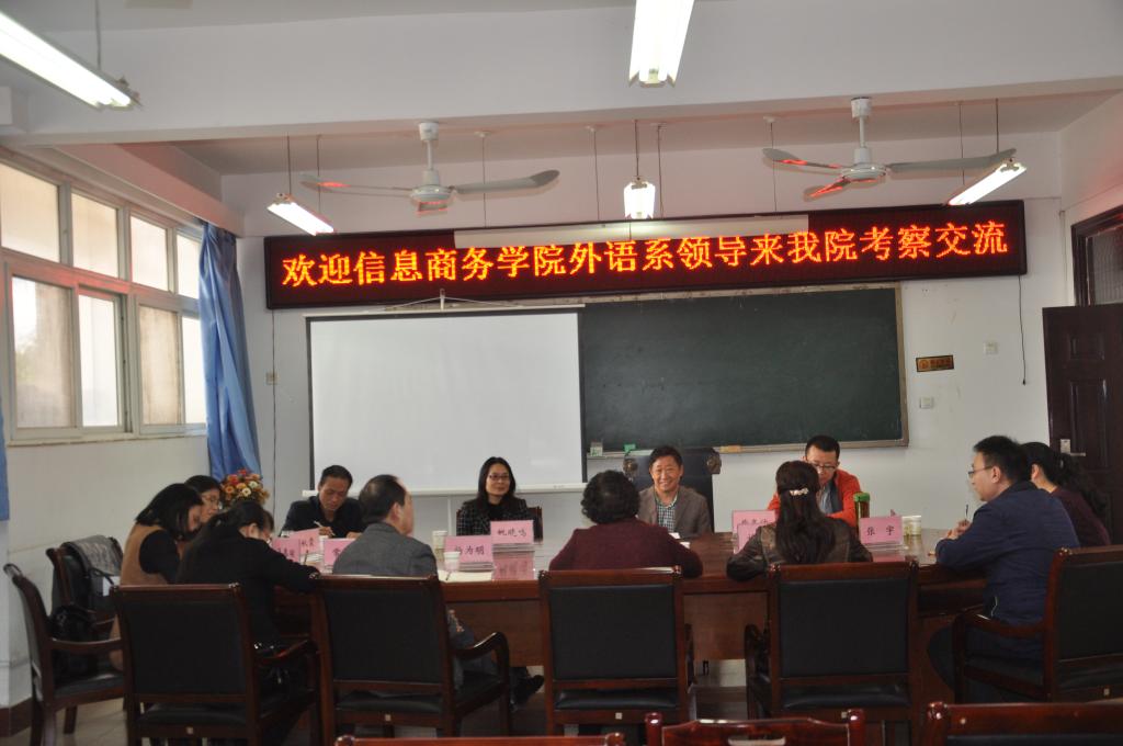 郭院长首先对王主任一行到来表示欢迎,接着从公共外语四个部门的职能分工、网络自主学习、学科建设、申报硕士点、科研、师资队伍发展等方面介绍了今年会专业教学和大学英语教学的基本情况。王主任对信息商务学院外语系的师资和教学开展情况,以及此次来访调研的主要问题进行了简要介绍。然后,双方分别针对如何进一步提高大学英语四、六级考试通过率、英语专业学生考研率;如何扩大信息商务学院翻译专业招生等问题进行了深入的对口交流。