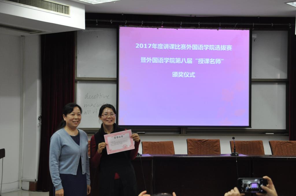 郭银玲教授代表全体评委做了点评,并为一等奖获得者余天敏老师颁发荣誉证书。她指出几位参赛教师准备充分,语言基本功好,教学经验丰富,每个老师都有自己的教学理念,同时郭教授也对参加校级讲课比赛的老师提出了宝贵建议。