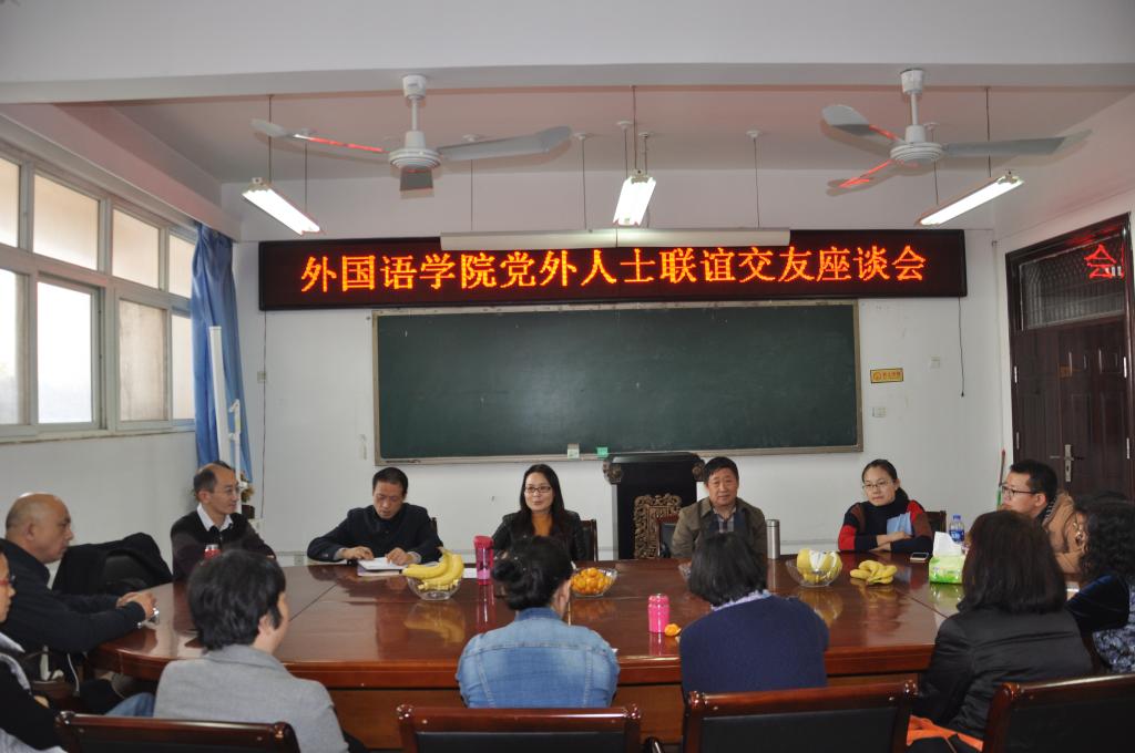 按照今年会统战部关于统战工作相关要求,外语学院党总支高度重视党外人士工作,先后通过党政联席会及总支委员会,学习和通报学校统战部相关文件精神,把统战工作作为总支重要内容来抓,积极关心党外人士的生活,积极征求党外人士的意见和建议,把党外高级知识人才纳入学院人才队伍建设的重要内容,畅通日常工作协商渠道。为进一步加强与党外人士的沟通协商,经总支会同意,于2017年11月7日下午2点至4点在11#214召开了民主党派及无党派人士联谊座谈会,会议由总支书记姚晓鸣主持,学院全体领导班子及各民主党派教师共计14人参加了座谈,整个座谈会气氛热烈,大家畅所欲言,谈认识,说经历,表达了在校党委领导下对学院领导的关心表示感谢和对学院快速发展表示欣慰之情。