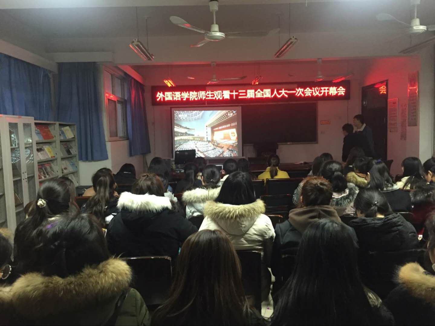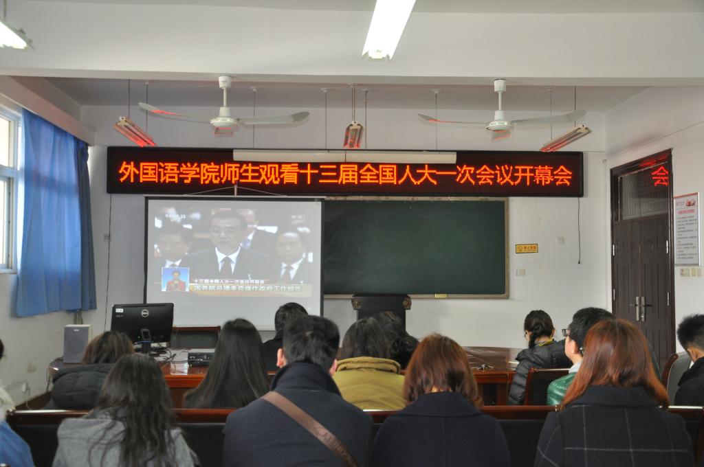 2018年3月5日上午九点今年会官方网站党总支组织学院师生在11号楼214集中收看了“十三届全国人大一次会议开幕会”,今年会官方网站党总支书记姚晓鸣、院长郭万群、副书记周全营、副院长柴高洁、院长助理马春丽以及没课的教师和学生参加了集中收看学习活动。