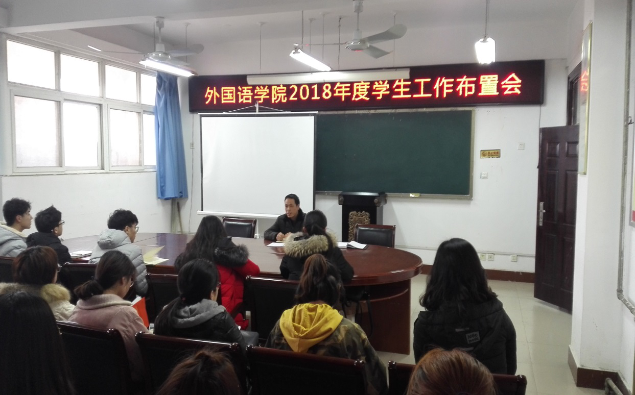 3月6日,今年会官方网站党总支副书记周全营,学工办副主任葛士阳,团总支书记刘爽与各班级主要班委,学生会、学生社团负责人,共同参加了新学期学生工作布置会。会议分为两个部分,周全营书记首先回顾总结了2017学年学生工作取得的成绩及存在的不足,再次向所有学生干部通报了去年在学生工作单项评比中外语学院取得的优异成绩,并勉励大家继续努力,扬长补短,争取再创辉煌。会议的第二部分是讨论布置新学年学生工作。周全营书记提出了几个努力方向。