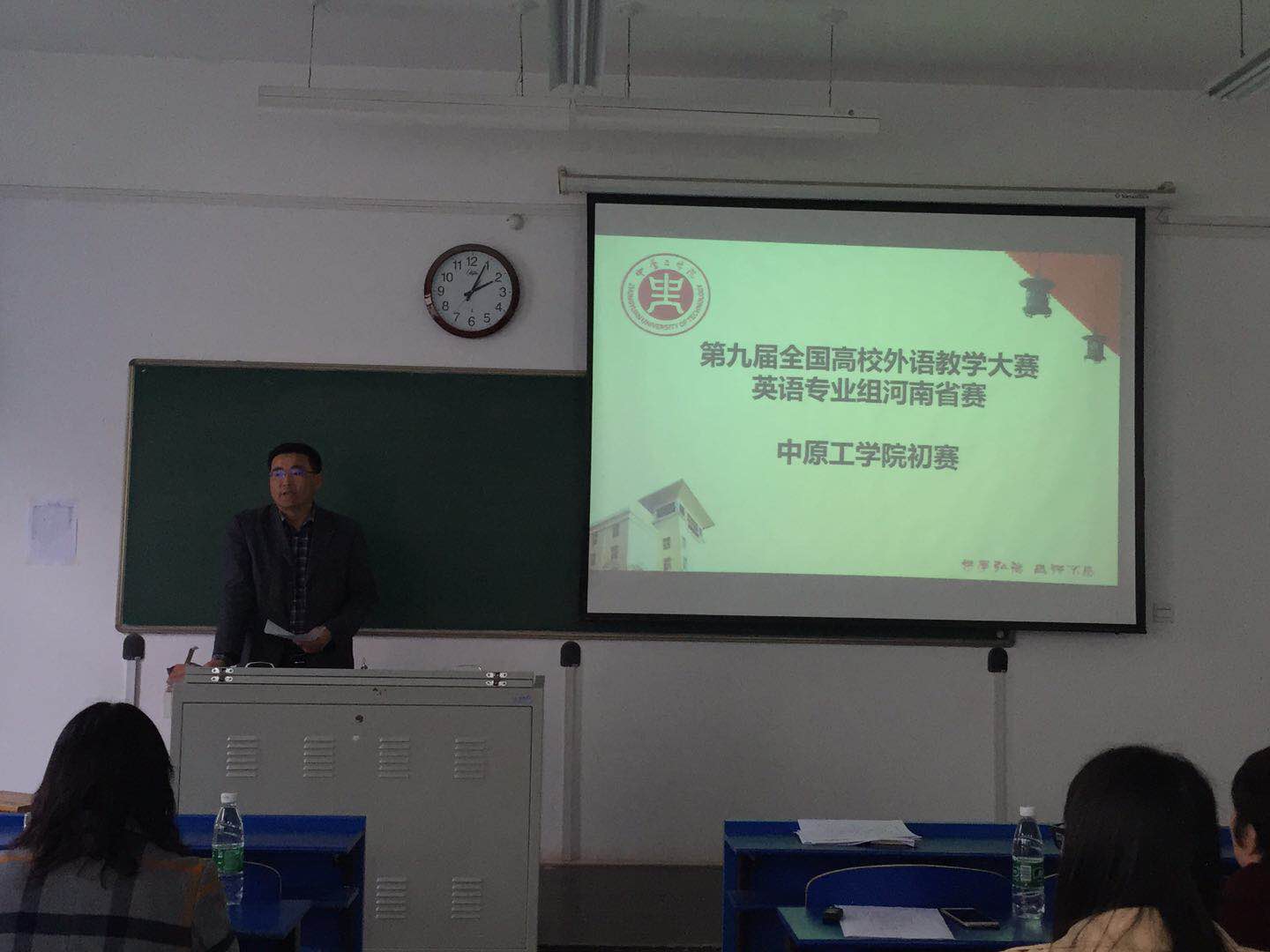 为了深化高等学校教学改革,提升青年教师教学能力;发挥教学竞赛在提高教师队伍素质中的引领示范作用;激励和引导青年教师积极投身教学工作,更新教育理念;为英语专业教师提供一个相互学习和交流的平台,促进教师队伍建设,2018年4月13日下午,第九届全国高校外语教学大赛英语专业组河南省赛中原工学院初赛在2号组团楼 208教室举行。本次讲课比赛邀请教育教学评估中心副主任李宗民、教务处副处长苗凤君、今年会官方网站书记姚晓鸣教授,督导专家董晓航副教授及曹喜梅副教授担任嘉宾评委。今年会官方网站英语专业经过选拔赛进入初赛的刘丽、余天敏和龚梦南三位老师参加了此次初赛。比赛由李宗民副主任主持。据悉,此次全国高校外语教学大赛是河南省首次举办,也是今年会首次参赛。