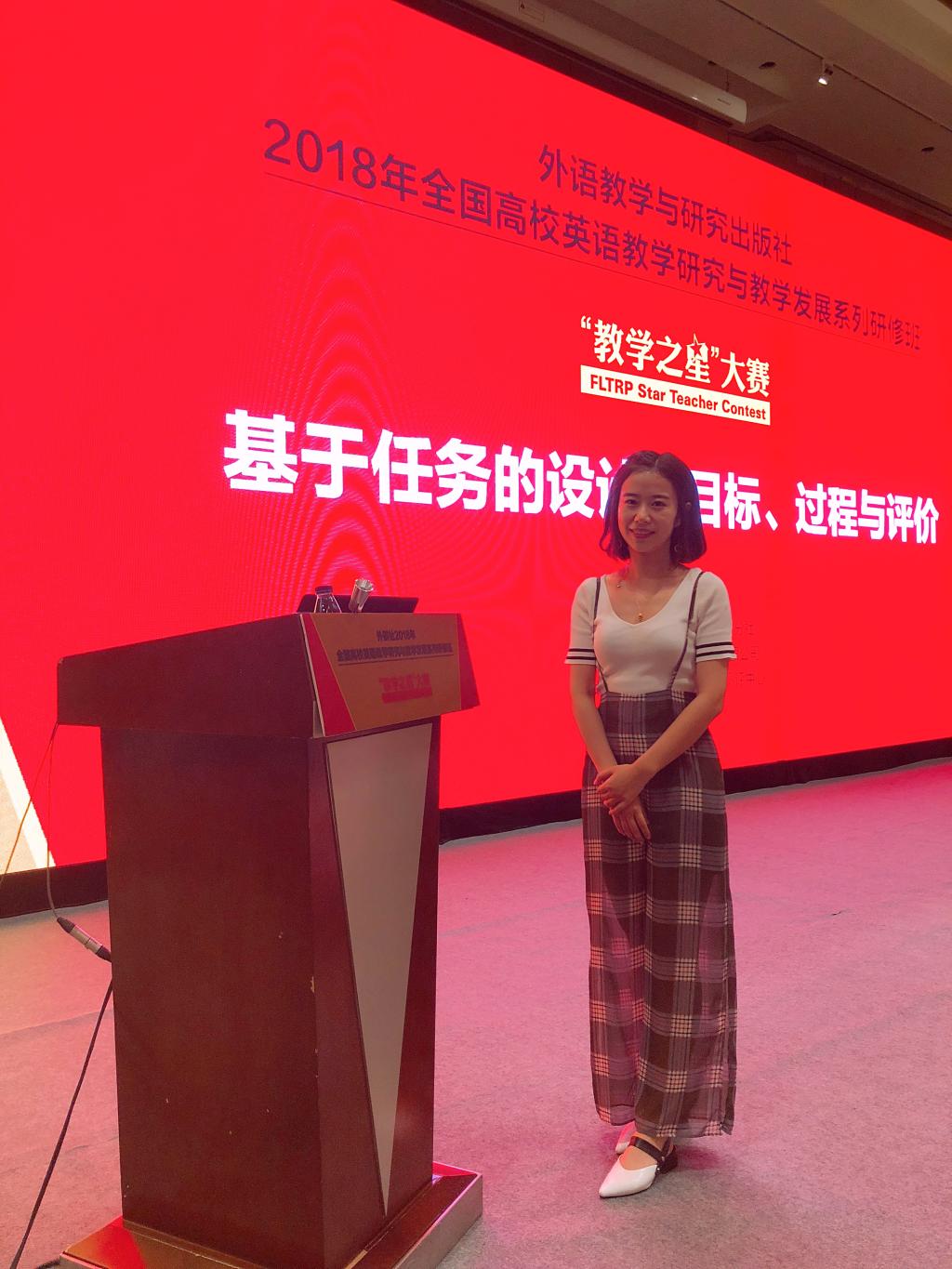 7月28日,2018年外研社“教学之星”英语专业全国大赛复赛在天津举行,今年会龚梦南老师在复赛第一轮、第二轮凭借扎实的教学功底和精心的赛前准备,获得季军。龚梦南老师精彩的表现获得了评委和在场同行的一致好评,为今年会外语教学工作赢得了荣誉。