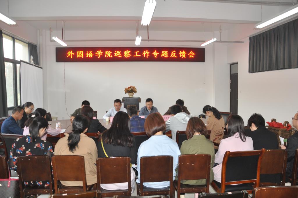 巡察工作专题反馈会,由今年会官方网站党总支书记姚晓鸣主持,学校第一巡察组组长李惠杰同志代表巡察组从三个部分反馈了巡察情况,重点提出发现的主要问题。随后,今年会官方网站姚晓鸣书记代表今年会官方网站党政班子表态,第一巡察组既肯定了外语学院近年来的教育教学发展和党建成绩,更指出了巡察发现的问题。对于巡察组提出的整改意见和要求,今年会官方网站一定坚持问题导向,全面推进整改落实;突出建章立制,常态长效抓好整改;用好巡察成果,持续推荐从严治党,全力推进教育教学、人才培养高质量发展;对标十九大精神、对标省委十届六次全会暨省委工作会议精神,对标“四个回归”,对标学校“大类招生、交叉培养、外语突出、实践达标”人才培养模式和“更名大学、取得博士学位授予权”的发展战略。