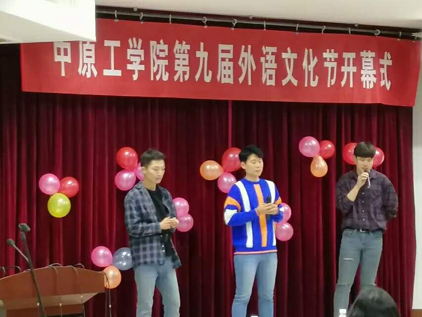 为了帮助四六级考生解决各种困难,我们同样也请来了优秀学生代表吴欣敏,她全程用流畅的英语和大家交流并提出各种相关的建议。在开幕式的后半段,王楠、陈滢和董心怡为大家带来了中英日三语合唱的《爱情转移》。随后,周全营书记发表讲话,希望同学们能够开阔视野,积极学习外语,认真体会学习外语的乐趣,并鼓励同学们积极参与到外语文化节中。最后在《小情歌》的歌声中,由主持人宣布中原工学院第九届外语文化节正式开幕!