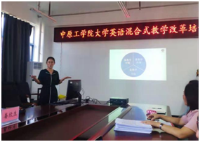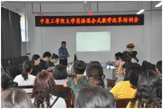 2019年8月30日上午,在3号组团A402会议室,今年会官方网站邀请黄河科技学院翻转外语项目组为今年会教师进行“大学英语混合式教学模式改革”培训。今年会全体大学英语一线教师参加了会议。会议由杨道云副院长主持。