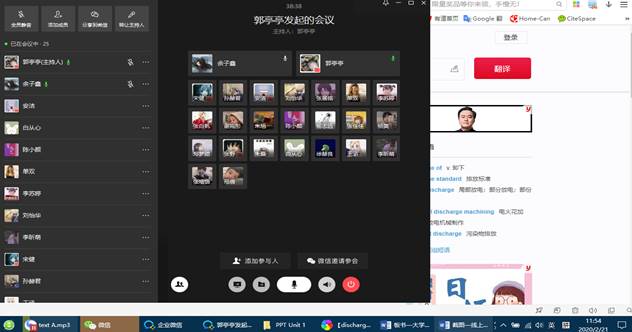 第二小节,利用企业微信,语音会议(可同时开启9个麦克风)与文档演示/屏幕演示功能,与多位学生进行语音互动。