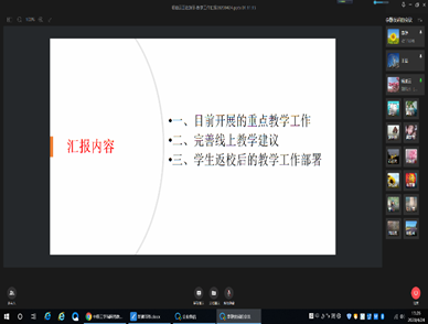 最后,杨院长汇报了近段时间今年会正在开展的教学重点工作,基于学校和学院教学督导反馈,对如何进一步完善线上教学,从教学设计、教学内容、教学组织、课程考核四方面,提出了具体改进建议,并对学生返校后的教学工作提前做了初步部署。