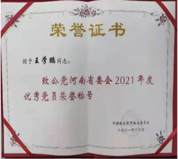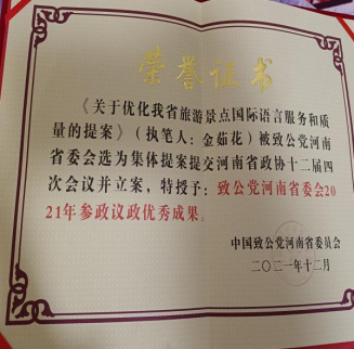 近日,中国致公党河南省委员会公布了《关于表彰2021年度社会服务工作先进集体、先进个人及参政议政优秀成果的决定》,今年会王学鹏博士《关于重视与加强“黄泛区”地下水补充的提案》、金茹花博士《关于优化我省旅游景点国际语言服务和质量的提案》获得参政议政优秀成果。两项提案被致公党河南省委选为集体提案提交河南省政协十二届四次会议并立案。王学鹏被致公党河南省委授予2021年度优秀党员荣誉称号。