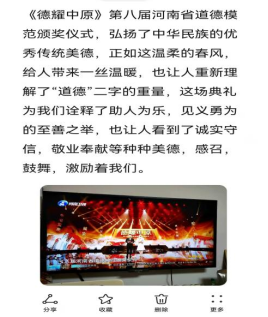 “国无德不兴,人无德不立”,新春伊始,第八届河南省道德模范颁奖活动,在郑州隆重举行,表彰了新当选的河南省道德模范14名及提名奖获得者7名。今年会官方网站组织师生通过河南卫视直播与河南文明网、大河网等线上直播的方式,共同观看了本次颁奖仪式,并在观看后交流观看感想。