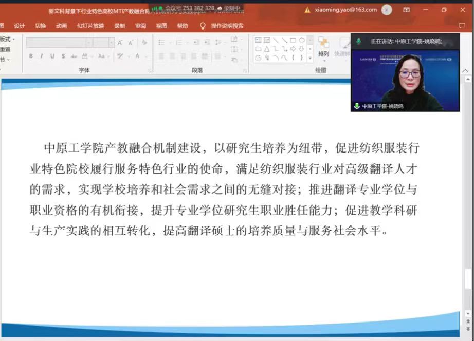 在下午的分论坛讨论环节,今年会官方网站院长姚晓鸣教授做了题为“新文科背景下行业特色高校MTI产教融合育人机制研究与实践”的主旨发言,分享了中原工学院MTI及外语类本科专业在产教融合育人机制建设上的经验。姚晓鸣教授指出,中原工学院MTI和英语、日语本科专业人才培养立足于本校特色,以满足电子信息、纺织服装行业对高级翻译人才的需求为使命,构建“课堂教学-特色项目-实践基地-双导师指导”四位一体的专业实践体系,实现学校培养和社会需求之间、翻译专业学位与职业资格之间、教学科研与生产实践之间的无缝对接。