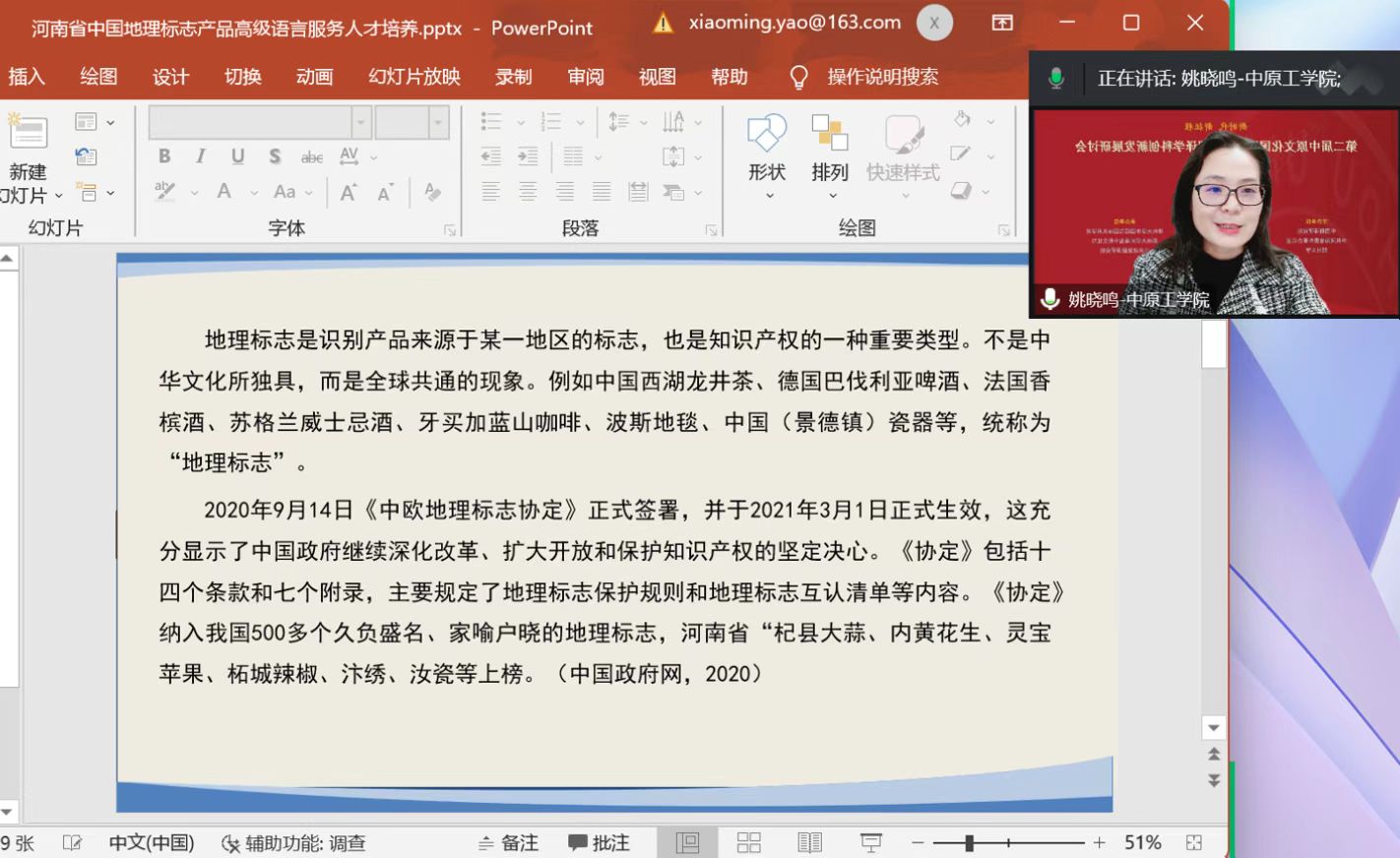 在下午的分论坛讨论环节,今年会官方网站院长姚晓鸣教授做了题为“河南中国地理标志产品高级语言服务人才培养”的主旨发言,分享了中原工学院在“黄河文化翻译与传播”方面所做的最新研究成果。姚晓鸣教授指出,地理标志产品不仅是物质文化的传承和传播,也是历史文化和精神文化的传承和传播,研究中国地理标志产品的海外推广和中国地理标志产品的高级语言服务人才培养,对促进河南文化传播、探索校企高级语言服务人才培养路径具有重要理论与实践意义。