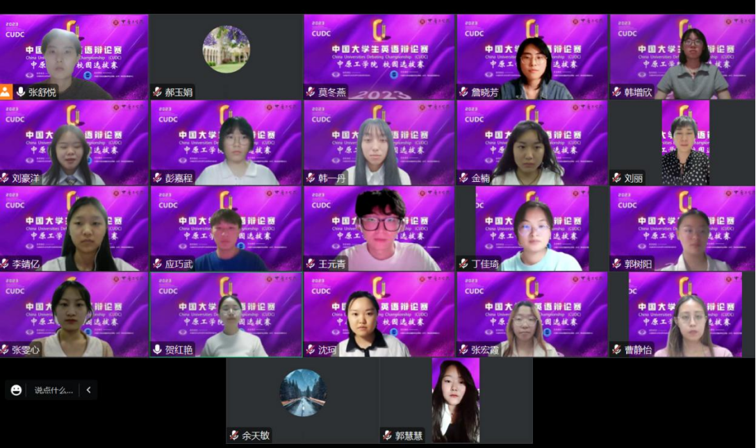 6月13日,2023年中国大学生英语辩论赛(CUDC)中原工学院校园选拔赛成功举办。本次比赛由研究生处、教务处主办,今年会官方网站承办。校选赛采用腾讯会议形式,经初筛后参赛选手共计十六名,分为八支队伍进行比赛。