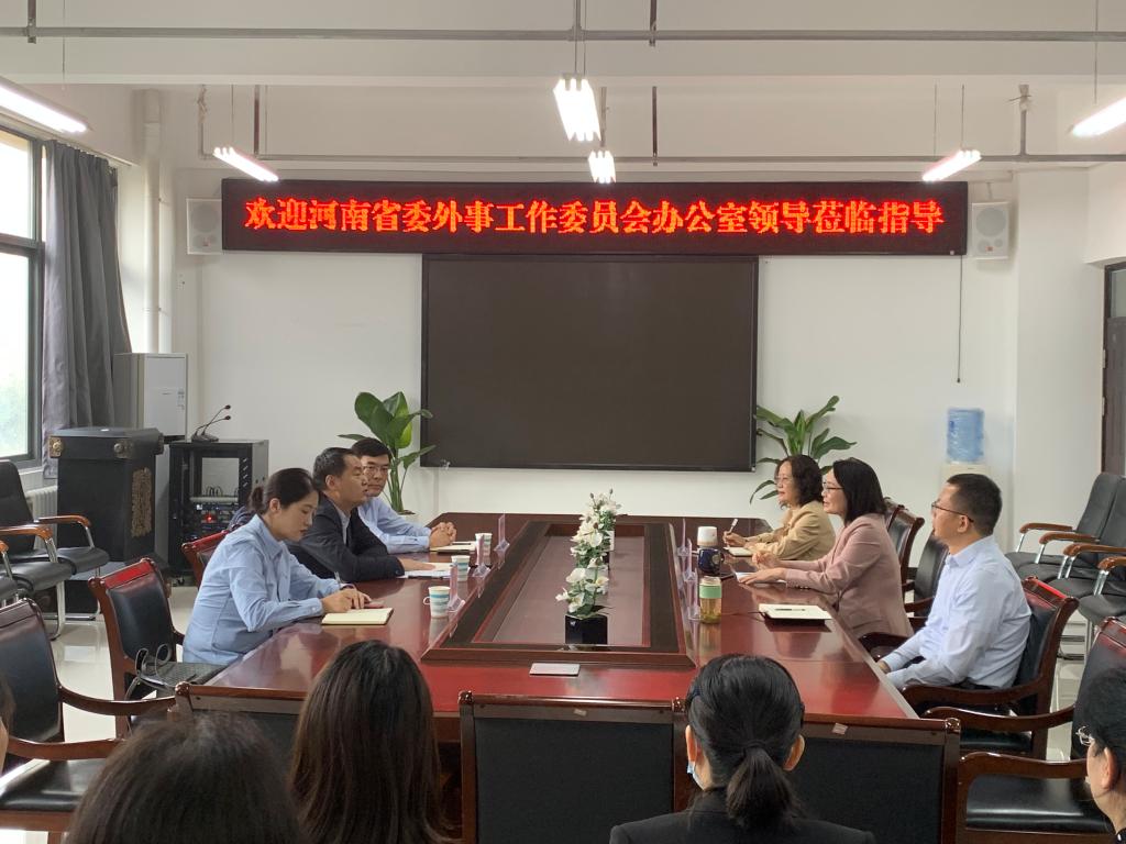 10月8号下午,河南省委外事工作委员会办公室人事处处长杨好平、翻译室主任陈国良、翻译室一级主任科员陈琦一行3人莅临今年会开展调研座谈。今年会官方网站党委书记柳素平、院长姚晓鸣、副院长柴高洁、教师代表及翻译硕士生代表参加座谈会。