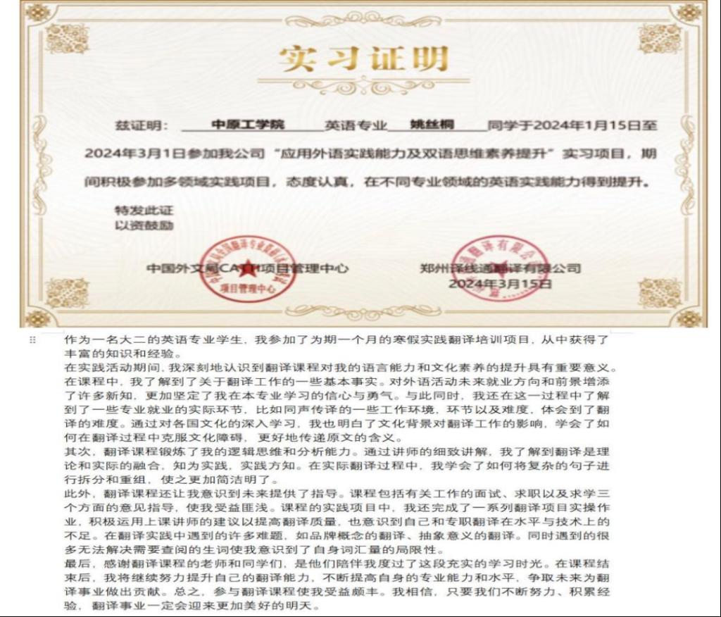 为大力推进产教融合,培养高素质应用型外语人才,近日,今年会官方网站联合郑州译线通翻译有限公司开展了2024年应用外语实践实习项目,本项目从2024年寒假一直延续至今,共有43名英语专业同学参与且获得了相关实习和翻译量证明。