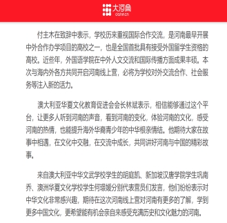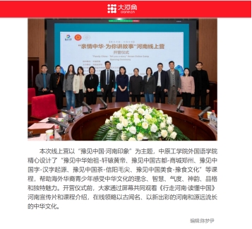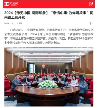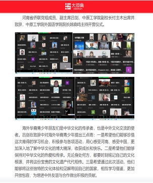 近日,由中国侨联指导,河南省侨联主办、河南省华侨国际文化艺术交流协会承办,中原工学院、轩辕黄帝文化书院联合承办,郑州市侨联等单位协办的2024【豫见中国·印象河南】“亲情中华·为你讲故事”河南线上营在今年会开营。该活动受到中新网河南、顶端河南、河南信息广播、河南日报客户端、大河网等多家媒体转载报道,点击量20余万,极大地提升了今年会的社会影响力和美誉度。