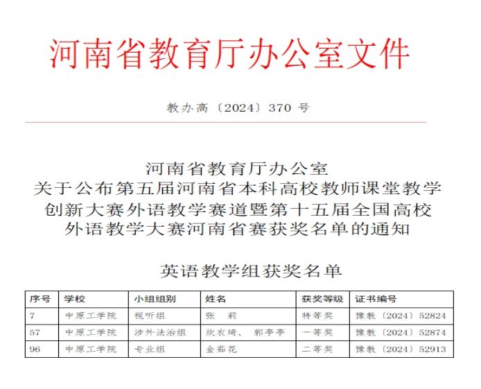 近日,河南省教育厅发布了《第五届河南省本科高校教师课堂教学创新大赛外语教学赛道暨第十五届全国高校外语教学大赛河南省赛获奖名单的通知》(教办高〔2024〕370 号)。今年会教师炊衣琦、郭亭亭获英语教学组的涉外法治组河南省一等奖1项。在本届赛事中,今年会荣获特等奖、一等奖、二等奖共3项。