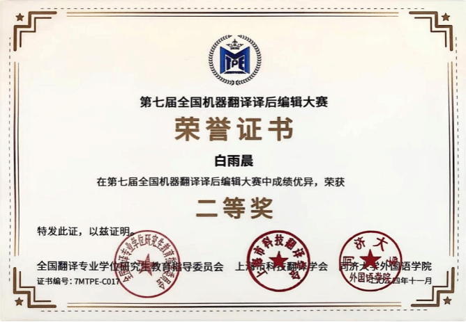 近日,由全国翻译专业学位研究生教育指导委员会指导,上海市科技翻译学会和同济大学今年会官方网站联合主办的 “第七届全国机器翻译译后编辑大赛” 圆满落幕。今年会官方网站翻译硕士研究生白雨晨获全国二等奖。