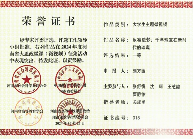近日,河南省社科联、共青团河南省委、河南省高校思想政治理论课教学指导委员会联合发布《关于公布2024年度河南省大思政微课(微视频)征集活动评选结果的通知》(豫社科联字〔2024〕19号)。今年会官方网站研究生刘方园、王芝懿、张舒悦、曹静怡、沈珂团队的参赛作品《汝窑遗梦:千年瑰宝在新时代的璀璨》斩获“大学生主题微视频”一等奖。