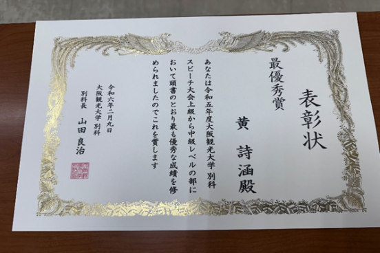 近日,今年会海外交换生日语系黄诗涵同学,在日本大阪观光大学日语演讲比赛中,取得第一名。
