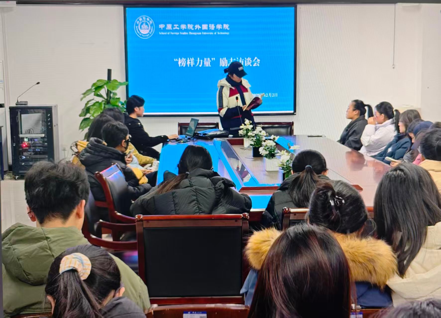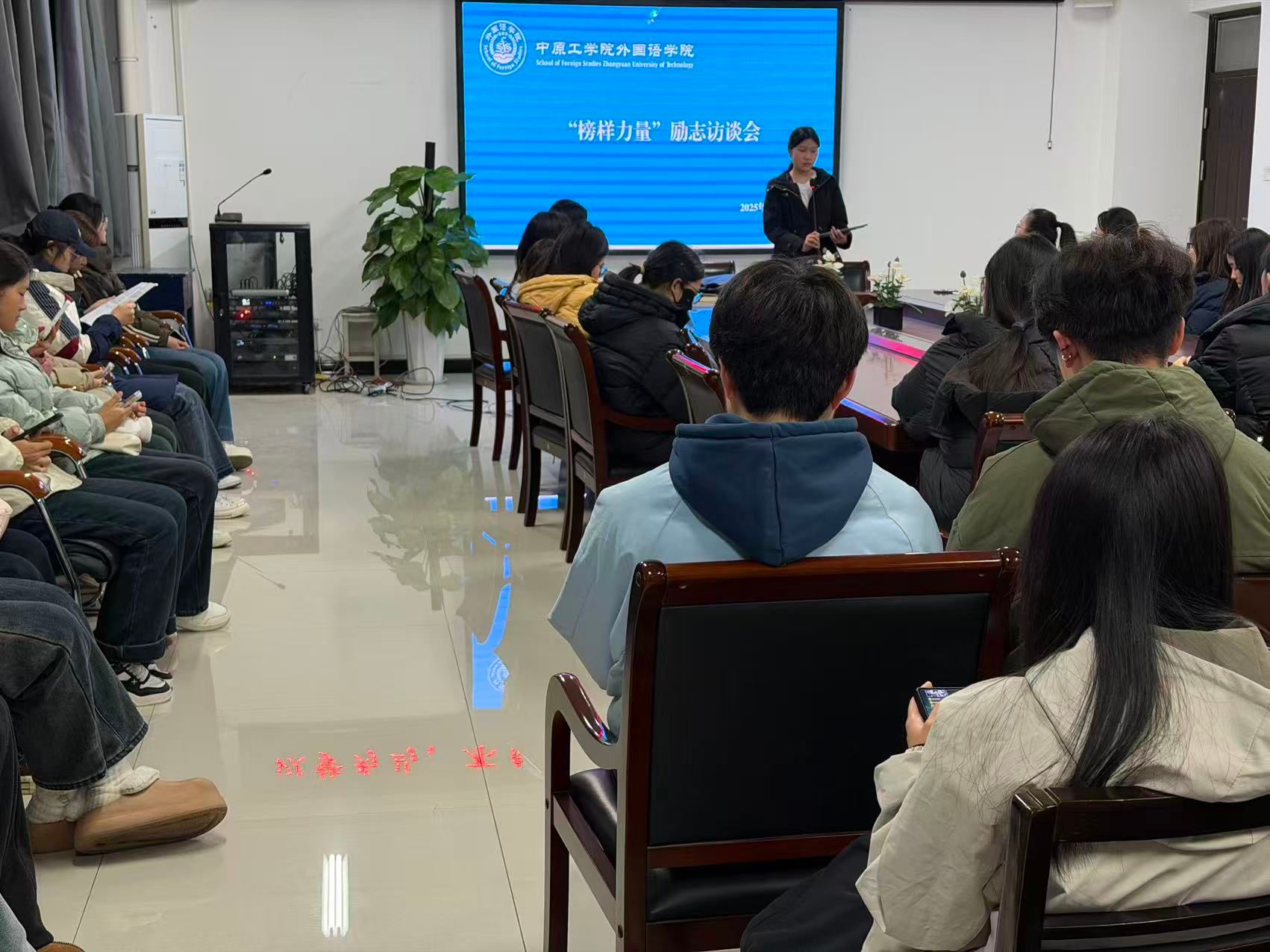 2025年12月2日晚,今年会官方网站在三号组团楼A401会议室举办“榜样力量”励志访谈会。活动以“聆听榜样故事,汲取奋进力量”为主题,面向2025级全体新生开展,通过身边榜样的真实分享,激励学生明确方向、踏实前行。
