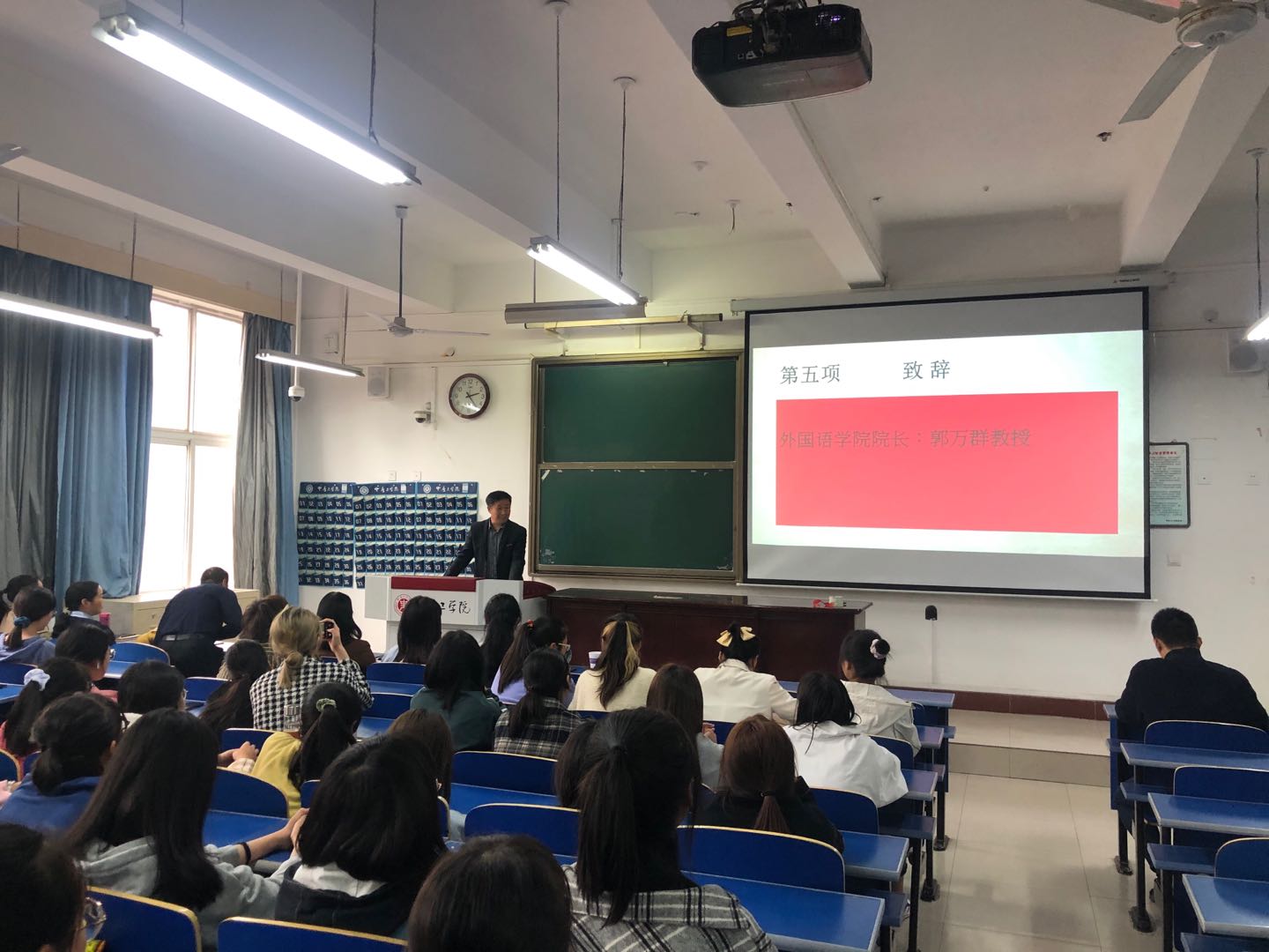 郭万群院长围绕 “明德至善”进行讲话并致辞,对今年会官方网站的整体师资情况进行介绍,让新生对今年会官方网站有了更深层次了解,以问答启迪大学意义,最后提出了“LLCCCC”(Language Learning Critical Creative Cultural Cooperate)的素养要求,并用Wish you have a meaningful and healthy life表达了对新生的祝愿。
