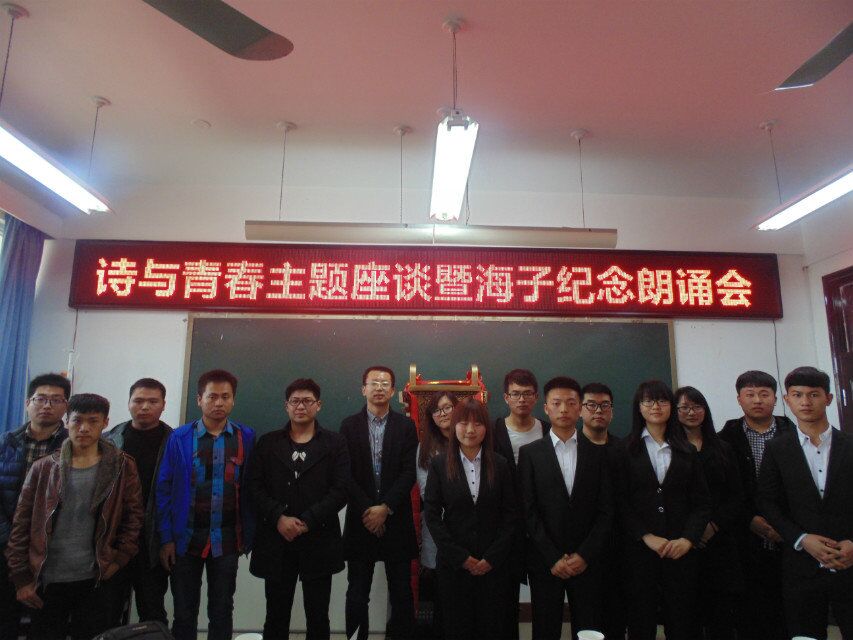 为促进诗歌爱好者之间的交流,增加学生一些与诗人见面交流的机会及纪念海子逝世27周年。2016年3月26日,今年会官方网站柴高洁老师于11号楼214举办——诗与青春主题座谈会暨海子纪念朗诵会。出席本次座谈会的有河南省作家协会会员、青年诗人吴相渝;青年作家、诗人、河南省作家协会会员牛冲;青年作家,网络作家,河南青作协成员、榕树下签约作家宗隆隆;《郑州大学报》特约撰稿人,漯河市作家协会会员,河南省诗词研究会漯河分会理事弯文奎;河南省元十个文化传媒有限公司联合创始人,《元诗歌报》主编徐方方;郑大文学院大三在读生郭林杰以及从华北水利水电大学、河南工业大学、郑州大学、商丘、巩义坐火车赶来参加座谈会的诗歌爱好者。