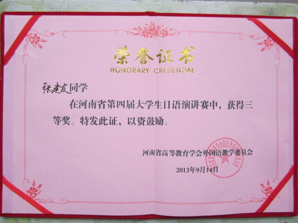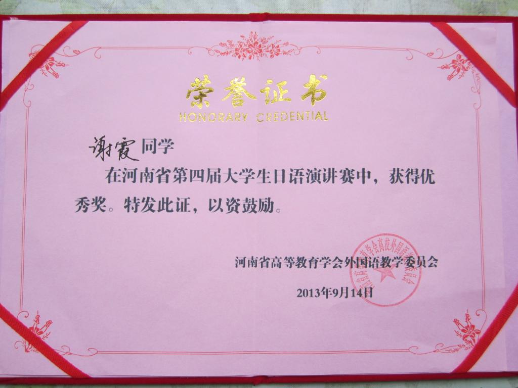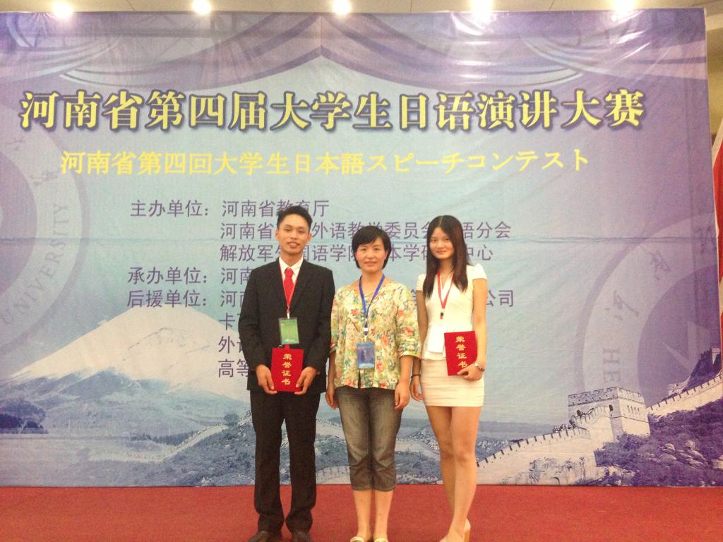 2013年9月14日,第四届河南省大学生日语演讲比赛在焦作成功举办,本次大赛由河南省教育厅及高等教育学会外国语教学委员会主办,河南理工大学承办,吸引了众多高校学生参赛。今年会官方网站日语系10级学生谢霞和张建友同学代表学校参赛。大赛分为主题演讲和即兴演讲两个环节,上午的主题演讲环节各位选手旗鼓相当、难分伯仲,下午的即兴演讲环节将大赛推向了高潮。在带队老师于勇的悉心指导下,张建友和谢霞同学发挥稳定、表现突出,分获三等奖和优秀奖。