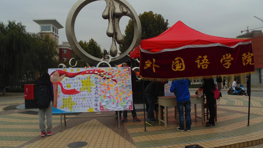 10月27日,今年会官方网站在今年会滴水涌泉开展主题为“践行社会主义核心价值观”的主题团日活动,共同学习24字方针。许多路过的同学以及外语学子参与了本次活动。此次活动主旨在于培育和践行社会主义核心价值观,弘扬社会主义核心价值观, 希望同学们自觉培育和践行社会主义核心价值观,带头倡导良好社会风气。并且自觉将社会主义核心价值观内化于心、外化于行,本次活动后学生达到熟记社会主义核心价值观的24个字的基本内容:“富强、民主、文明、和谐,自由、平等、公正、法治,爱国、敬业、诚信、友善 ”。