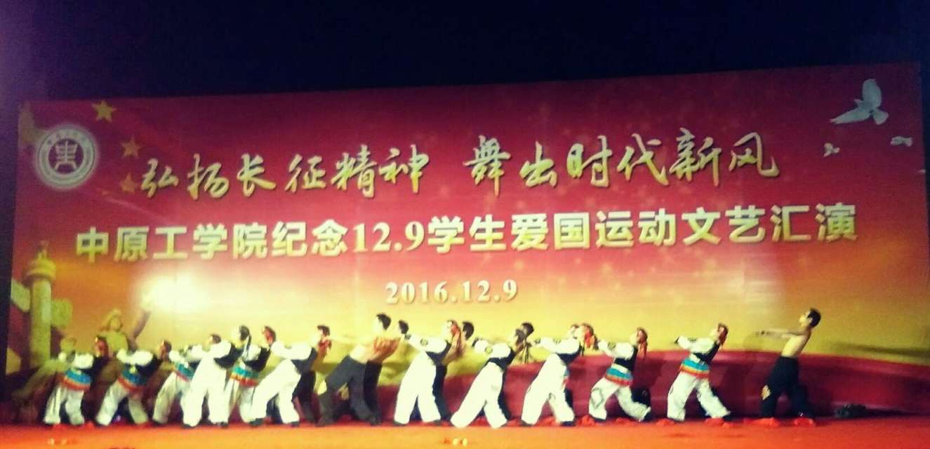 2016年12月9日中原工学院以“弘扬长征精神,舞出时代新风”为主题的纪念“一二九”学生爱国运动文艺晚会在体育馆举办,出席本次晚会的领导有今年会党委书记刘志刚,各学院党支部书记、副书记,参与本次晚会的有各学院学生会以及全体大一学生。