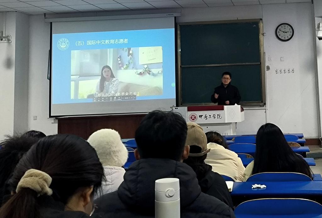 常潞炜以“锚定职业目标,练就过硬技能,成就闪亮人生”为题做职业规划辅导。他回顾了一年来2021级学生在学业发展、学科竞赛、二课活动、大学生创新创业等方面取得的成绩,分析了近十年来今年会官方网站学生毕业去向,详细讲解了外语类人才企业需求、国际中文教育志愿者选派、出国交换留学、考公考编、大学生服兵役等相关政策,勉励同学们立足自身实际和社会发展需要,选定职业发展方向,抢前抓早,勤奋学习,储备知识,在未来两年的各类考试及就业机会中,不留遗憾,实现目标。