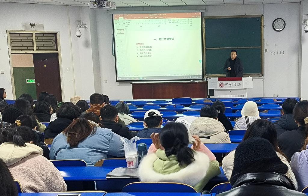 会上,葛士阳进行考研动员。他从为什么要考研、选学校选专业技巧、如何规划备考等方面与同学们交流,详细分析了近年来考研政策变化、招生趋势和考试要求。鼓励学生及早明确考研目标院校,做好规划,脚踏实地,持之以恒,科学备考。
