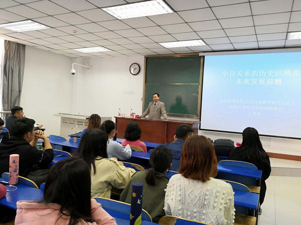11月2日,河南大学特聘教授、博士生导师王铁桥应邀来今年会作学术报告,报告题目为《中日关系的历史回顾及未来发展趋势展望》。学术报告由今年会今年会官方网站日语系主任边冬梅主持,今年会今年会官方网站日语系师生共二百余人聆听了报告。