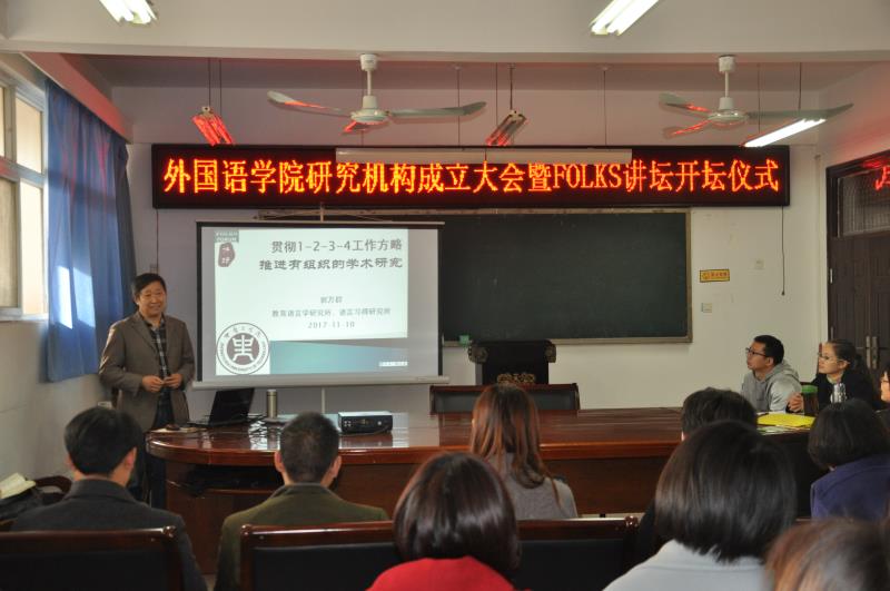 会议第二个议程,今年会官方网站FOLKS讲坛开坛仪式,并由院长郭万群进行FOLKS讲坛开坛第一讲,讲座题目为《贯彻1-2-3-4工作方略推进有组织的学术研究》。FOLKS是校级研究机构“语言与传播研究所”英文首字母的简称,意涵在于团队合作与共享,彰显团队归属意识。FOLKS讲坛的启动,与各研究所的成立,将有利于营造学院的科研和学术氛围。院长郭万群的讲座深入浅出,结合自己多年的经验和感受,从“坚持‘一体化’道路”、“追求‘二元’价值”、“融汇‘三种’意识”、“促引‘四化’建设”等四个方面展开,在宏观与微观结合中,分享了如何有效且高效的进行学术研究,并且对研究所提出了具体的年度要求。