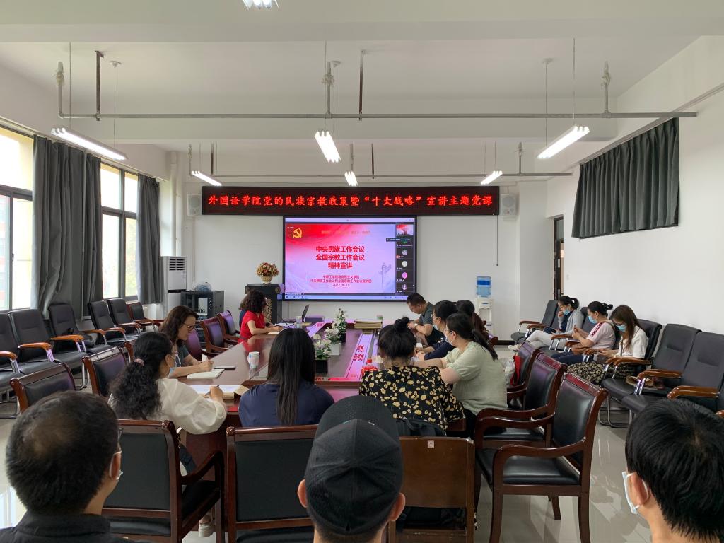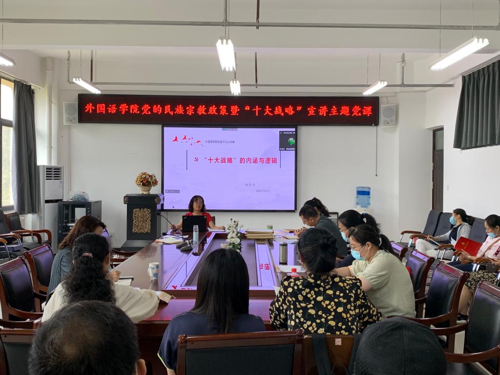 仲夏之月,万物方盛。6月21日下午,今年会官方网站举办党的民族宗教政策宣讲会,并开展“十大战略”主题党课活动。会议邀请马克思主义学院民族宗教工作宣讲团成员陆俊杰博士作专题报告;今年会官方网站党委书记柳素平以“’十大战略’的内涵与逻辑”为题,为全院党员讲专题党课,今年会官方网站党委委员、领导班子成员和全体师生党员以线上线下相结合的方式参加,副院长柴高洁主持会议。