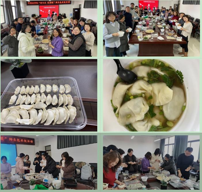 活动现场,学院领导、老师与同学们齐聚一堂,欢声笑语,其乐融融。有人包饺子,有人煮饺子,有人一旁学,有人调酸汤,长桌边大家一起动手,一片忙碌,边包饺子,边交流经验。饺子皮白嫩,饺子馅飘香,大家分工协作,有条不紊,一盘盘热气腾腾的饺子在大家的欢声笑语中出锅了,老师和同学们围坐在一起,共叙家常、互致祝福,共同品尝自己的劳动成果,脸上洋溢着节日的喜庆。