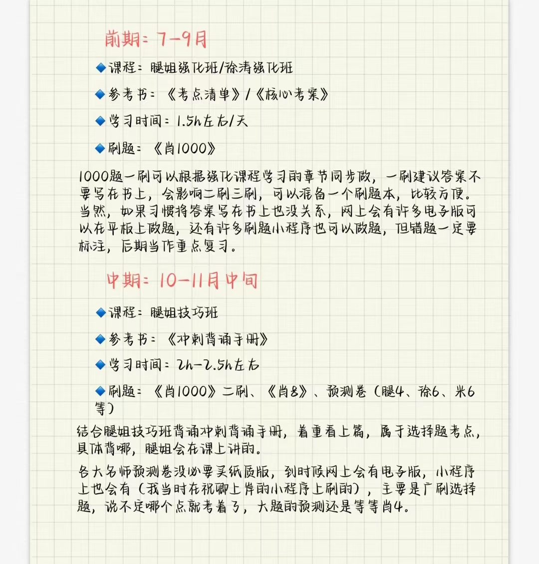 C. 政治是结合肖老师的资料、听腿姐的课,11月中之前都是在做政治选择题,选择题非常重要!11月中之后开始背大题,主要是腿姐的冲刺背诵手册和肖四。