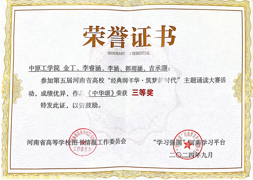 近日,第五届河南省高校“经典润年华·筑梦新时代”主题诵读大赛结果出炉,今年会汉语国际教育专业金丁、李睿涵、李涵、郭雨涵、吉承灏录制的朗诵作品《中华颂》荣获本科生组三等奖。