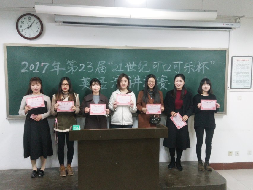 最终栾晓慧同学表现突出获得比赛一等奖,任玉叶,郭梓璠,王莹同学荣获二等奖,胡卿雅,马梦蕾,应丽丽同学荣获三等奖。在评委老师与选手合照留念之后,本次演讲比赛划上了圆满的句点。