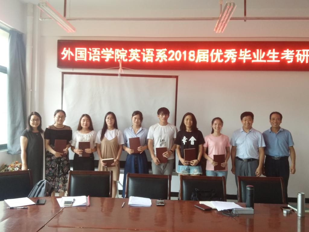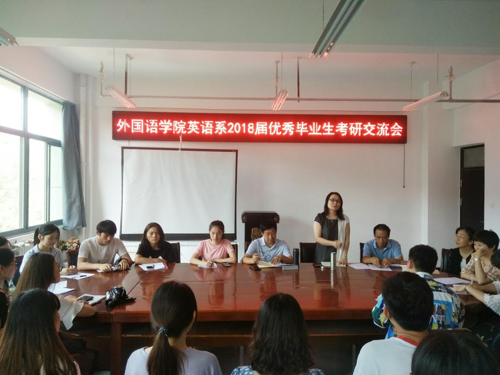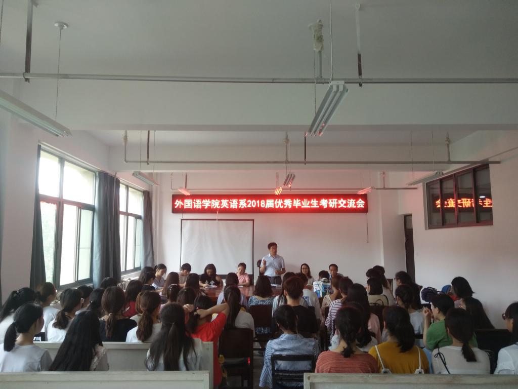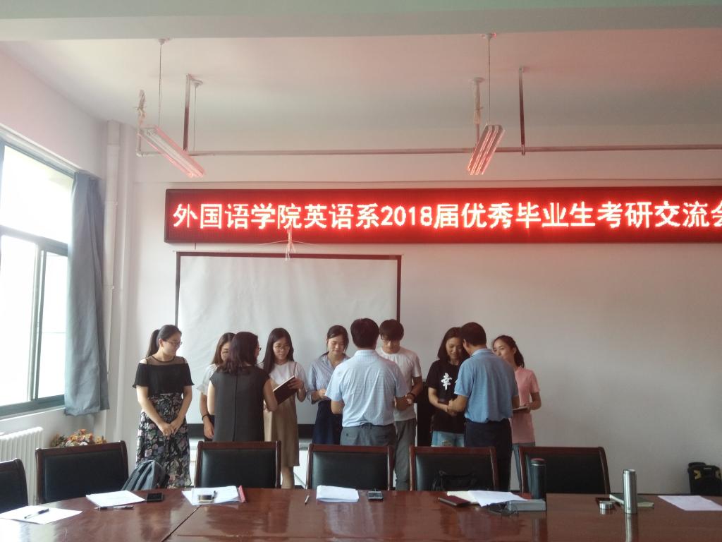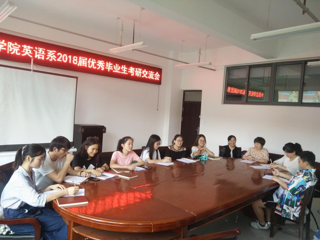 为了进一步提高今年会学生的考研热情,明确考研目标,掌握相关考研技巧,了解更多考研信息,今年会于2018年6月15日中午12点45分在三号组团楼402教室举办了今年会官方网站英语系2018届优秀毕业生考研交流会。出席本次交流会领导老师有今年会官方网站院长郭万群、党总支书记姚晓鸣、党总支副书记周全营、英语系系主任郝玉娟、英语系副主任刘丽、英语系教师代表郭亭亭以及在今年成功考研的七位优秀毕业生,他们分别是:熊小红、耿志梅、赵真霞、赵美月、顾晓雨、张士鑫、朱思晴。